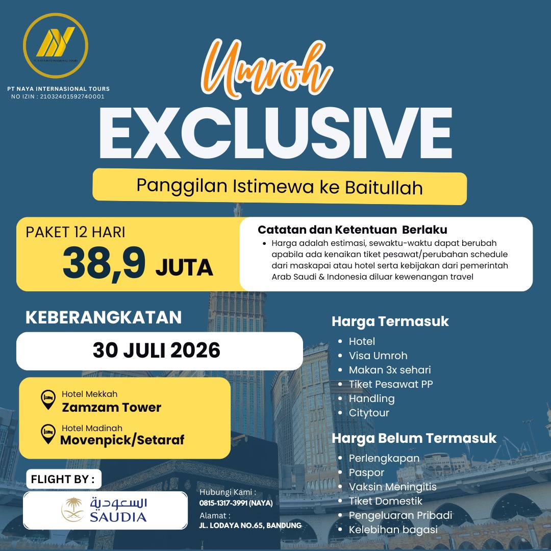 Nikmati pengalaman ibadah premium melalui Paket Umroh Exclusive 12 Hari keberangkatan 30 Juli 2026 bersama Naya Internasional Tours Bandung. Dilengkapi penerbangan nyaman bersama Saudi Airlines serta fasilitas hotel bintang 5, paket ini dirancang untuk memberikan kenyamanan maksimal selama Anda beribadah di tanah suci. Dengan layanan profesional dan pendampingan optimal, perjalanan umroh Anda akan terasa lebih tenang, khusyuk, dan berkelas.